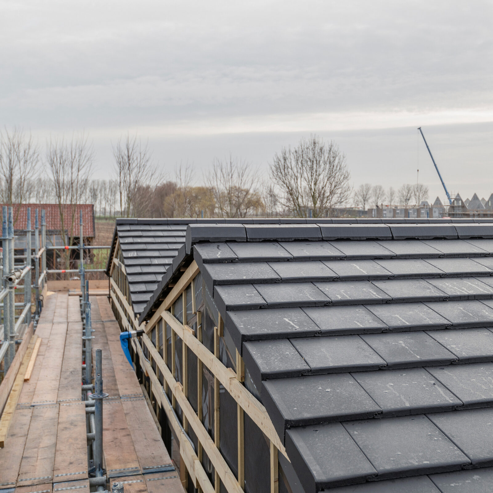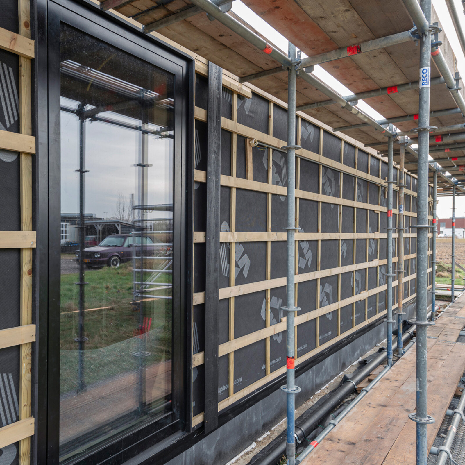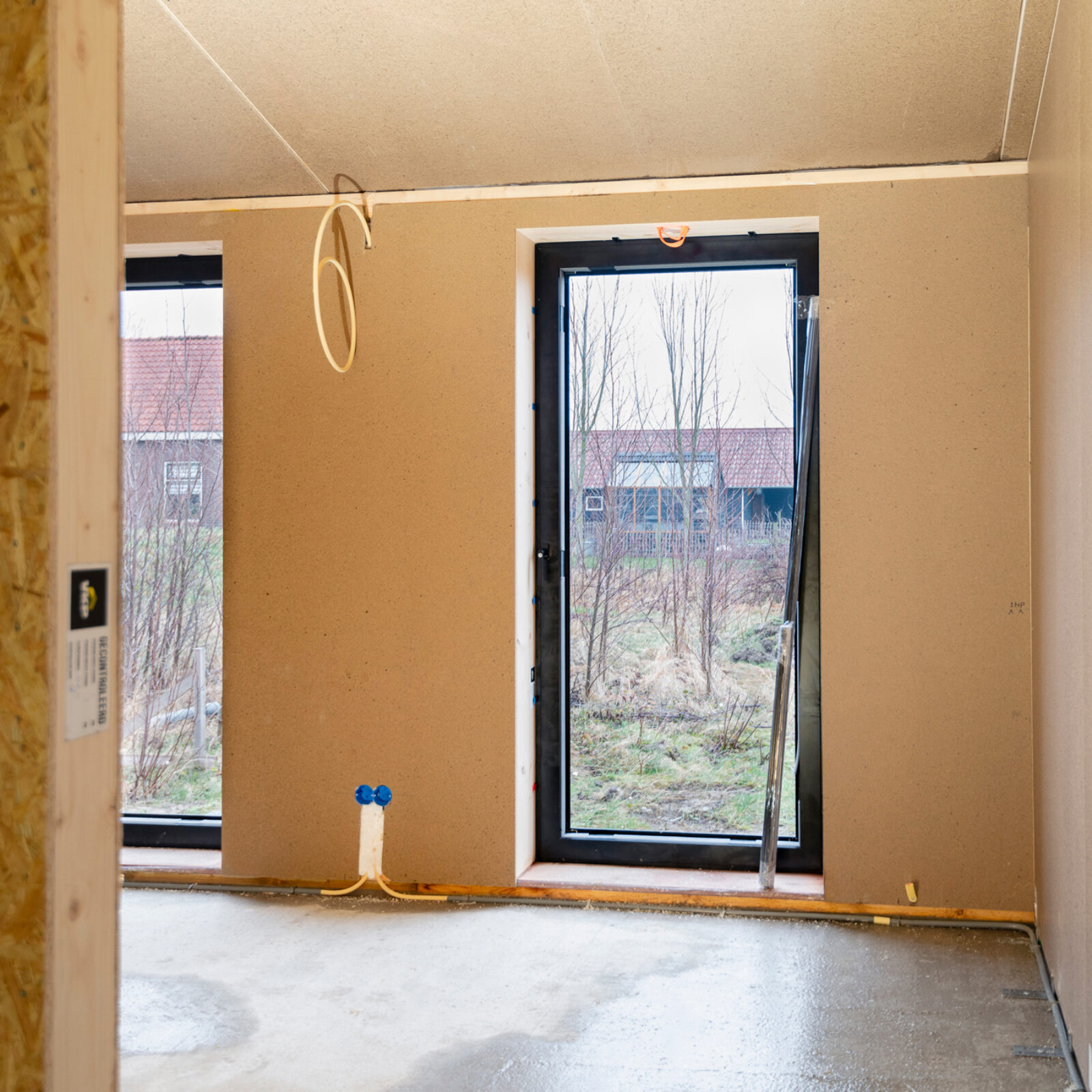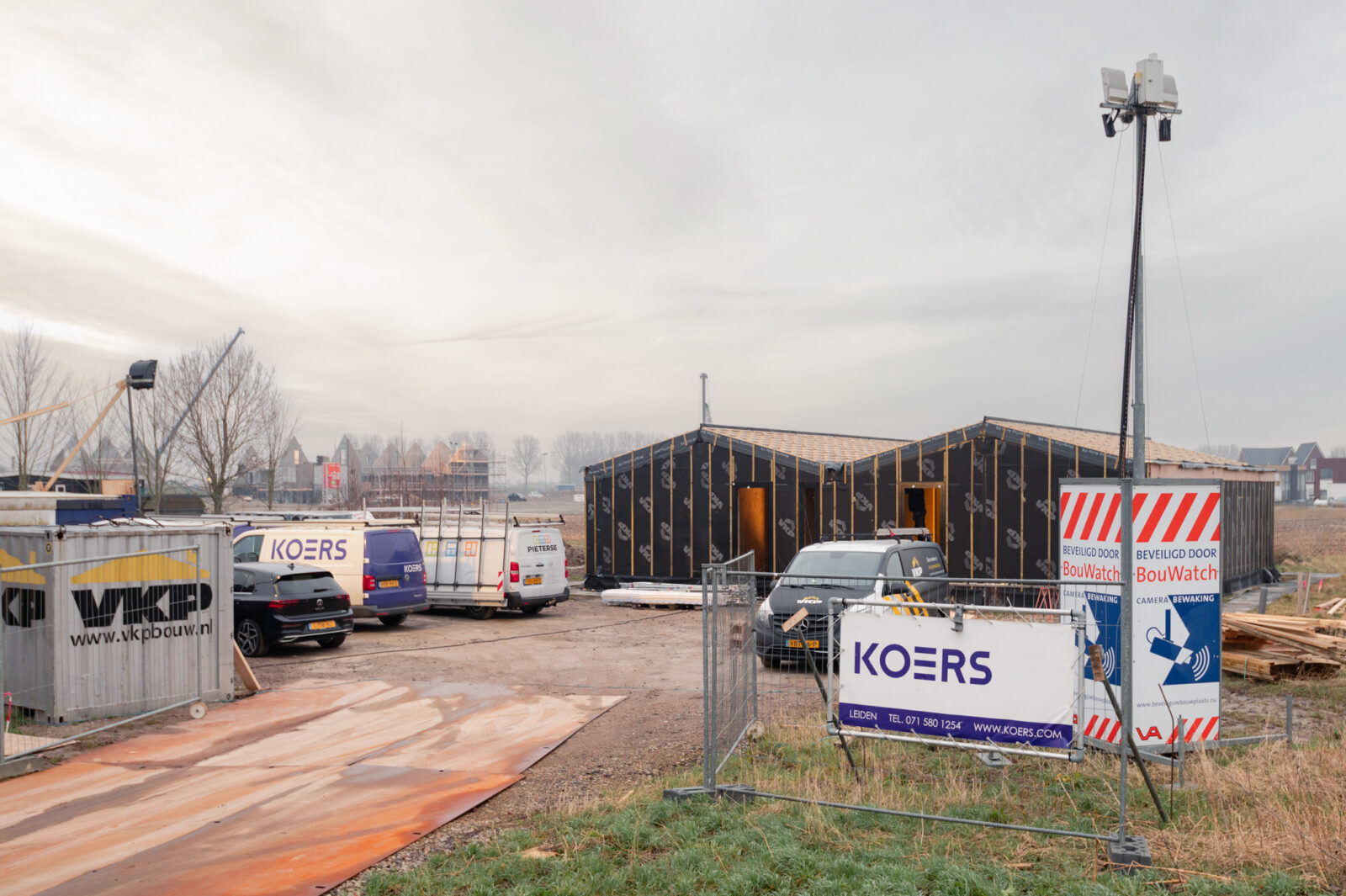 KOERS leverde de woning zogenaamd casco+ op en verzorgde, behalve de fundering, de maatvoering, de dakbedekking met pannen en de installatietechnische voorbereidingen. Waarbij in het schuimbeton, door onderaannemer installatiebedrijf Schouten, het water en riool werden meegestort. Terwijl houtskeletbouwer VKP met behulp van reeds geïsoleerde prefab houtskeletbouwelementen de complete woning realiseerde. Supersnel, aangezien in de fabriek al 90% van het voorbereidende werk werd uitgevoerd onder geconditioneerde omstandigheden.