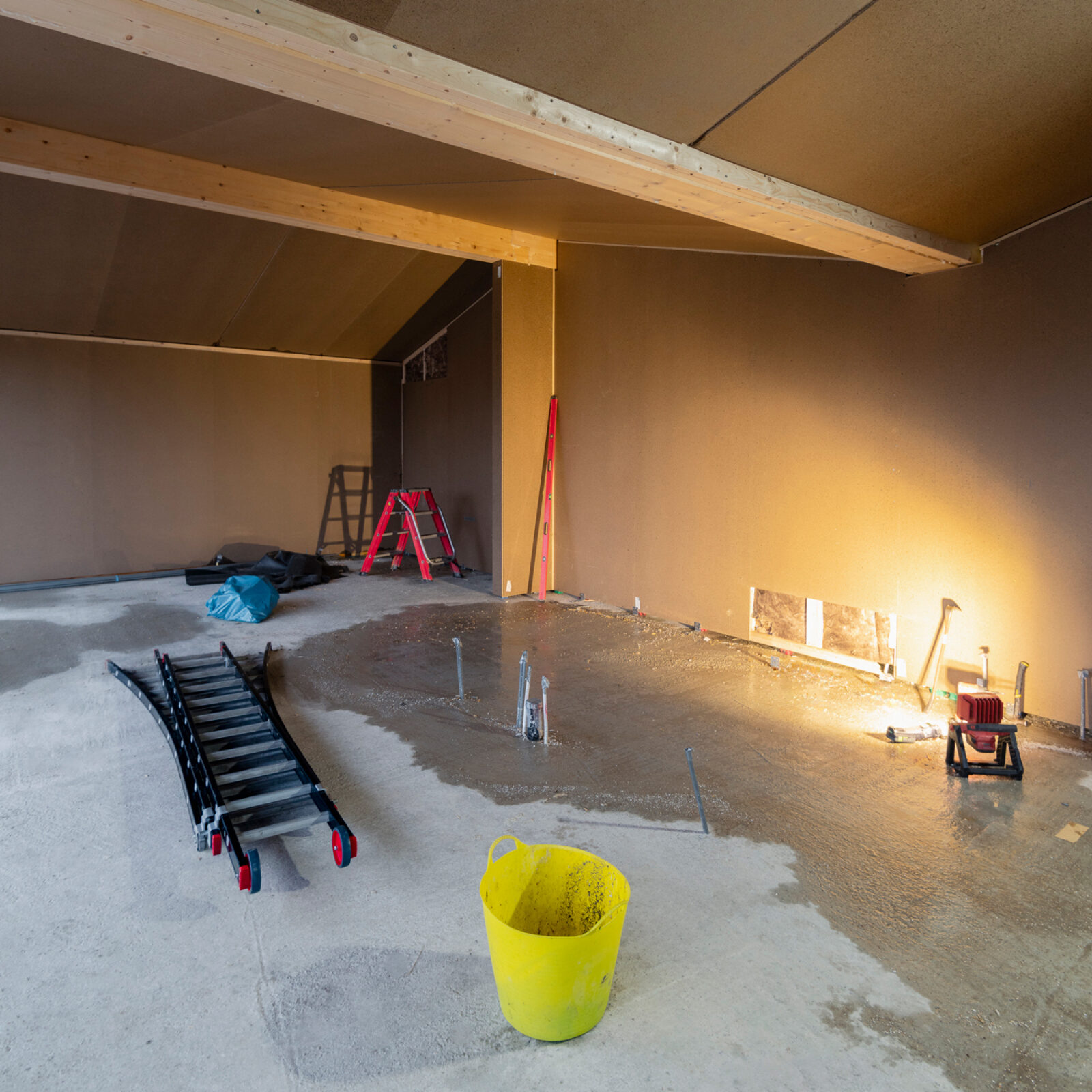 Terwijl er normaal gesproken flink wat heipalen de grond in gaan voor een dergelijke woning, is hier gekozen voor één grote plaat schuimbeton. Met daar bovenop een constructievloer van gewapend beton. Schuimbeton is een duurzame vloeibare mortel die samengesteld is uit cement, water, toeslagmaterialen en een schuimvormende hulpstof. Na het storten lost de hulpstof op, waardoor er een betonconstructie overblijft met heel veel kleine luchtbelletjes. Resulterend in een lichte, sterke vloer met een hoge isolatiewaarde. Die, zoals in Abbenbroek, in combinatie met een constructievloer van gewapend beton, een uitstekende fundering vormt voor een woning.
